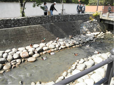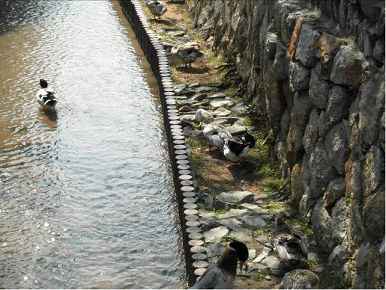ここでも鴨が泳いだりくつろいだりしている。向かい側の岸ではおじさんが立ち止まって鳥に餌を