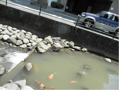 帰りに、通りの横の川に綺麗な錦鯉が川を泳いでいるので撮ってみた。