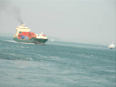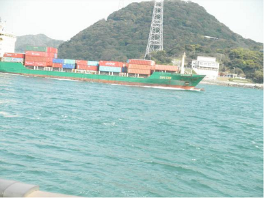 これは関門海峡を航行する船である。この船は積荷からコンテナ船らしい、コンテナ船の船首方向の