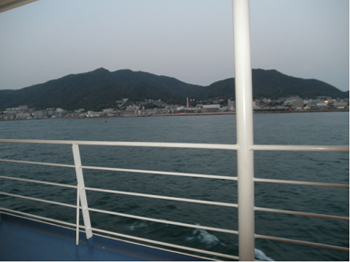 これは、関釜フェリーの船首側のデッキから撮った、朝焼けにしずむ岩礁と島の写真である。前に船首が見えているのが分るだろう、これが立ち入り禁止区画に一番近い船首側のデッキから撮ったものである。これ以上は立ち入り禁止区画になっている。横の方にハンガーで吊るさせている深緑色のものは非常時に船客や乗員を避難させる時に使われるボートである。