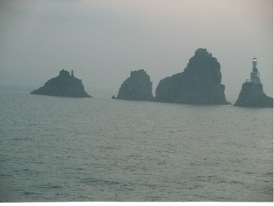 これが下関から釜山までの航路で撮った、朝焼けにしずむ岩礁である。画面の向かって、右側に灯台が見えている。夜には航路標識になるのだろう。いずれも、もう韓国側の領海にはいっている。