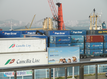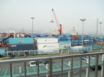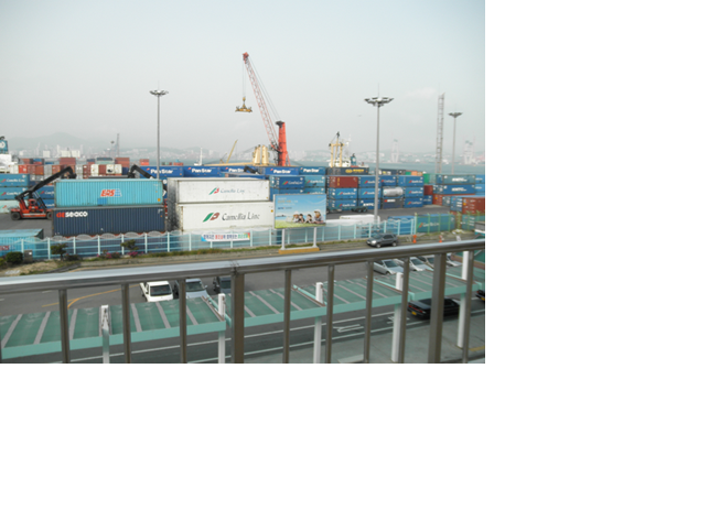 これが釜山港の朝の風景である。いろんなコンテナが積んであって釜山港の活気が良くわかる風景だ。